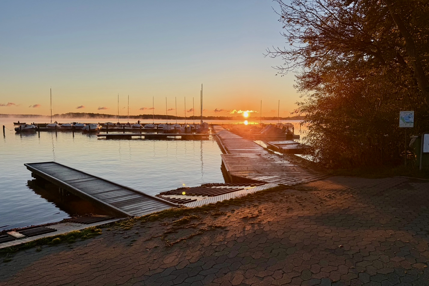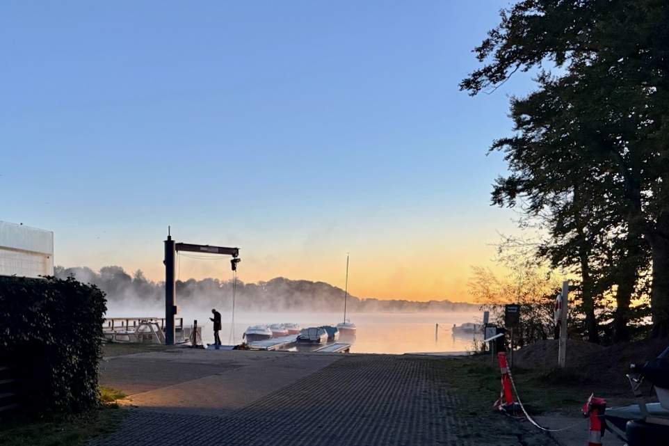 Det er d. 18. oktober, og optagning af både i havnen startede med den flotteste ved solopgang.