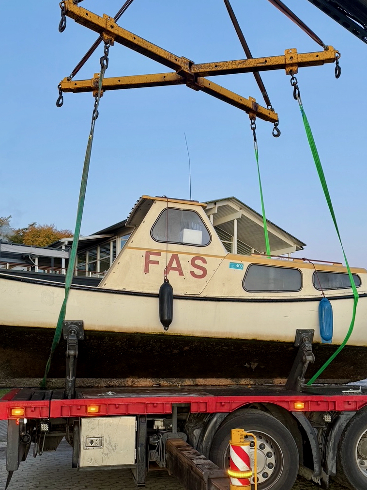 Foto: Både sejles over til Optibroen før de hejses op af lastbilen. Alt er timet og tilrettelagt!